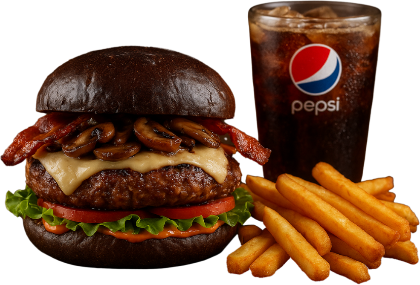 Juicy Angus beef, Swiss cheese, bacon & mushrooms on a toasted black brioche bun. Served with golden homemade fries and an ice-cold Pepsi 💙