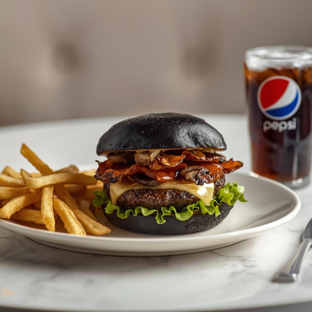 Juicy angus beef patty, Swiss cheese, bacon, mushrooms, lettuce, hot house sauce, on toasted black brioche bun. With ice-cold Pepsi