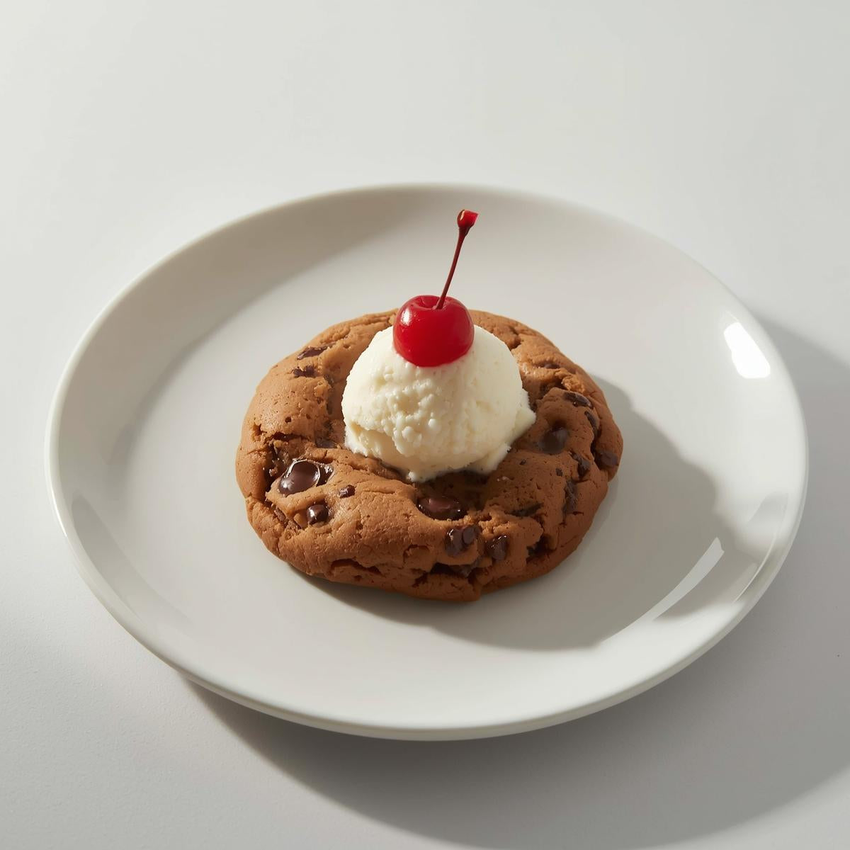 Warm chocolate chip cookie with vanilla ice cream and cherry $9.50 / XCG 17.10